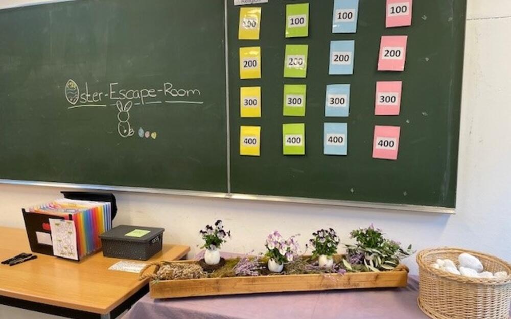 Seit letzter Woche Mittwoch wird das Osterzimmer eifrig von den Klassen der Primarstufe und der GE-Abteilung besucht. Es werden Rätsel gelöst, sich auf Spurensuche nach dem Osterhasen gemacht, die Ostergeschichte erlebt, Ostereier gesucht, Bilder gemalt, Traditionen zu Ostern erklärt und vieles mehr...