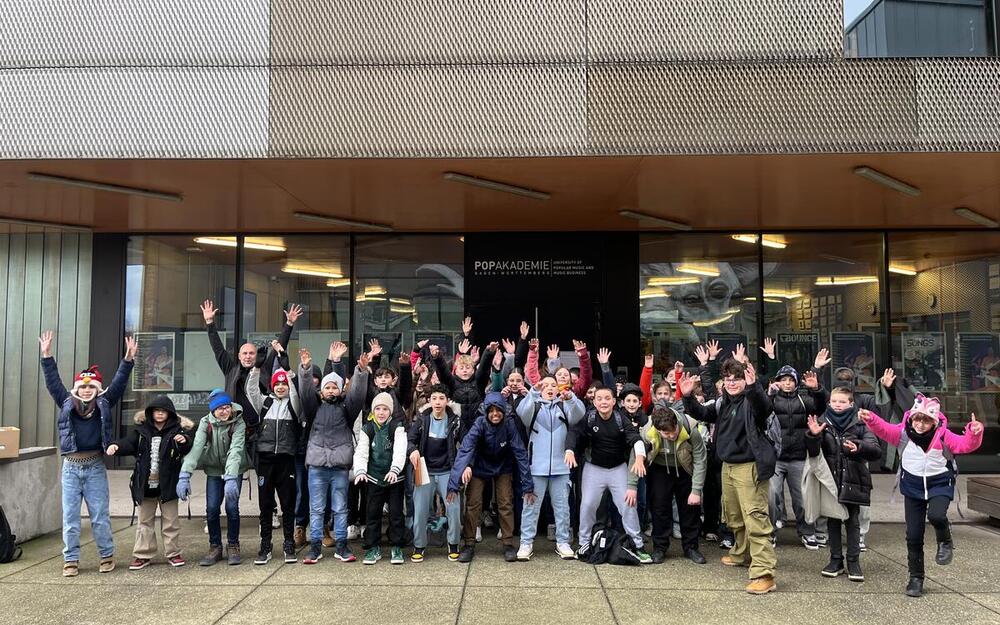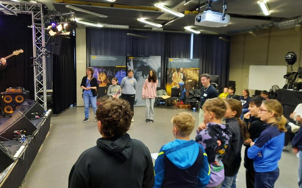 Am 26.02.2025 wurden Schülerinnen und Schüler der Klassenstufe 5–7 zu „Pop macht Schule“ in der Popakademie Mannheim eingeladen. Bereits beim Eintreffen begrüßten die MusikstudentInnen der Akademie die Gäste und stellten sich in einem musikalischen Auftakt vor.
